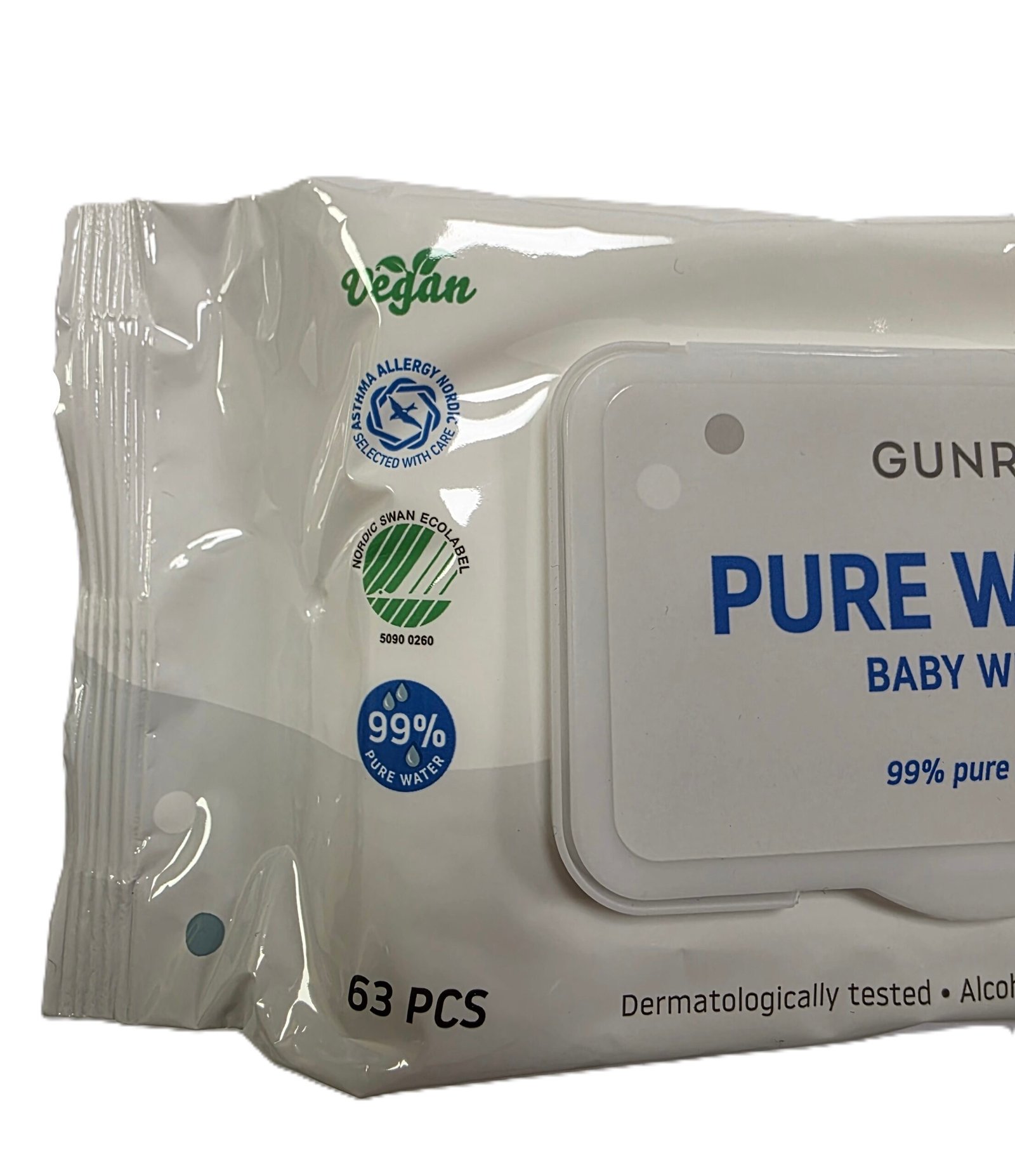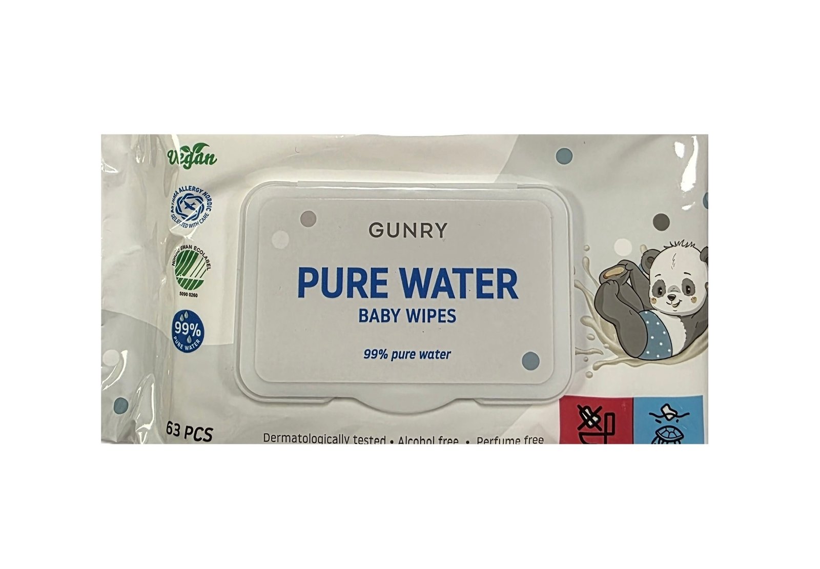 „Gunry Pure Water Baby Wipes“ — tai itin švelnios drėgnos servetėlės, specialiai sukurtos jautriai kūdikių odai. Sudėtyje yra net 99 % vandens, o papildomi ingredientai parinkti taip, kad būtų maksimaliai švelnūs ir saugūs. Produktas sertifikuotas „Svanen“ ekologiškuoju ženklu bei Švedijos Astmos ir alergijos asociacijos patvirtinimu.