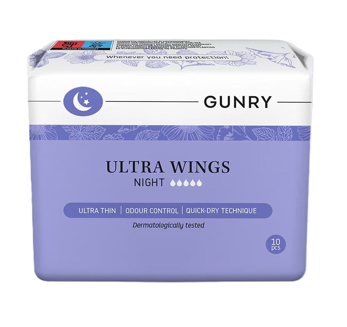 „Gunry Binda Ultra Wings Night“ – tai naktiniai menstruacijų paketai su sparneliais, sukurti maksimaliai apsaugai miego metu. Paketas turi prailgintą galinę dalį, užtikrinančią dar didesnį saugumą esant itin gausiam kraujavimui. Super absorbuojanti medžiaga tolygiai paskirsto skysčius, o Quick-dry technologija efektyviai sulaiko drėgmę bei kvapus, suteikdama sausumo pojūtį visą naktį. Apsauginiai sparneliai padeda išlaikyti paketą vietoje net ir aktyviai judant miego metu.